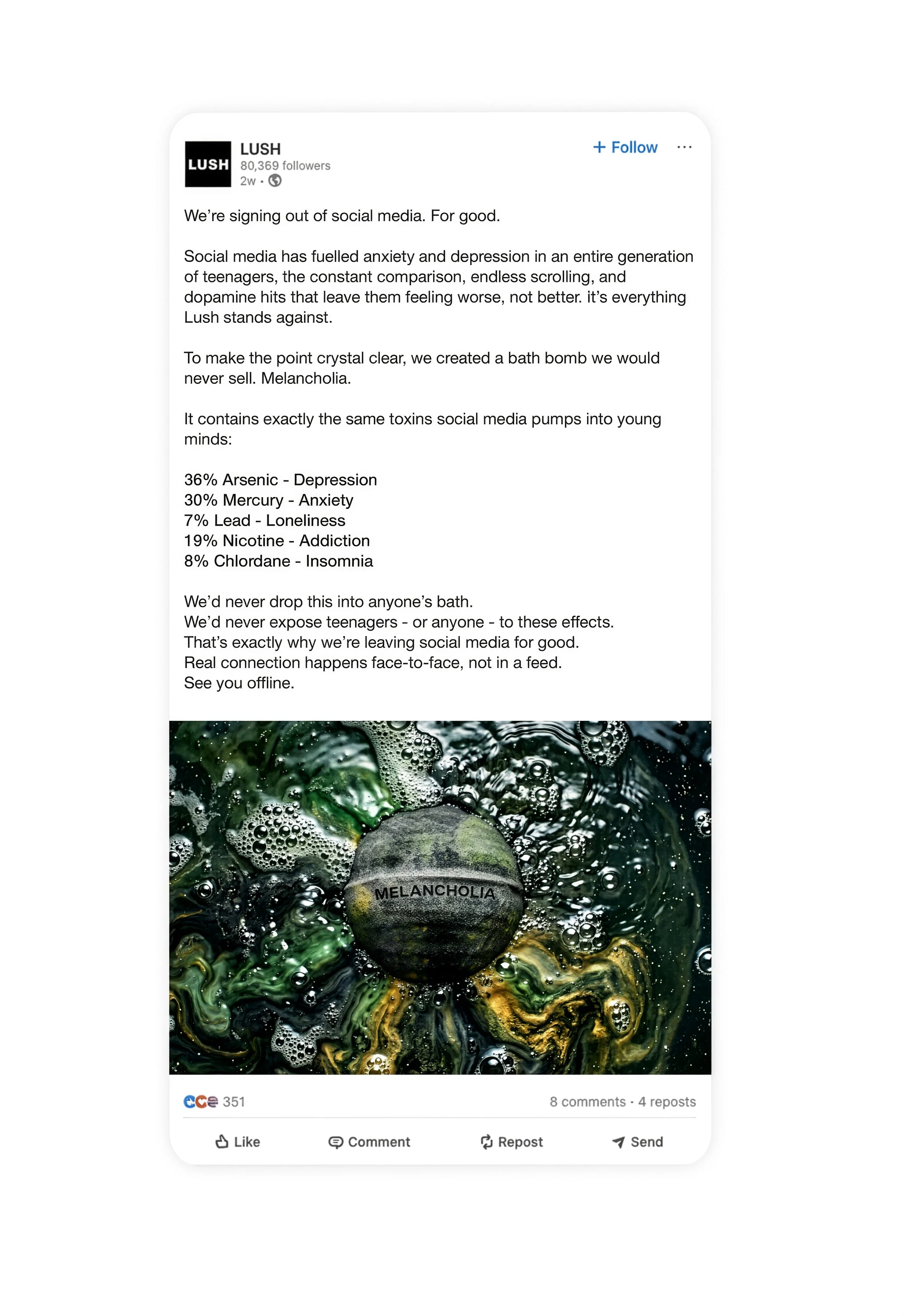 Social media has increased anxiety and depression in an entire generation of people. Not only is it toxic, it's everything Lush stands against.